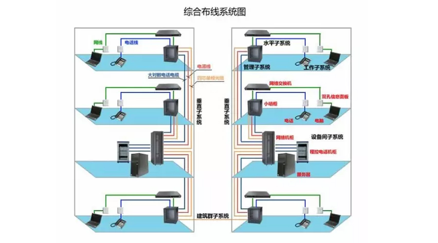 3)綜合布線系統由水平干線子系統、工作區子系統、垂直干線子系統、管理間子系統及設備間子系統構成。