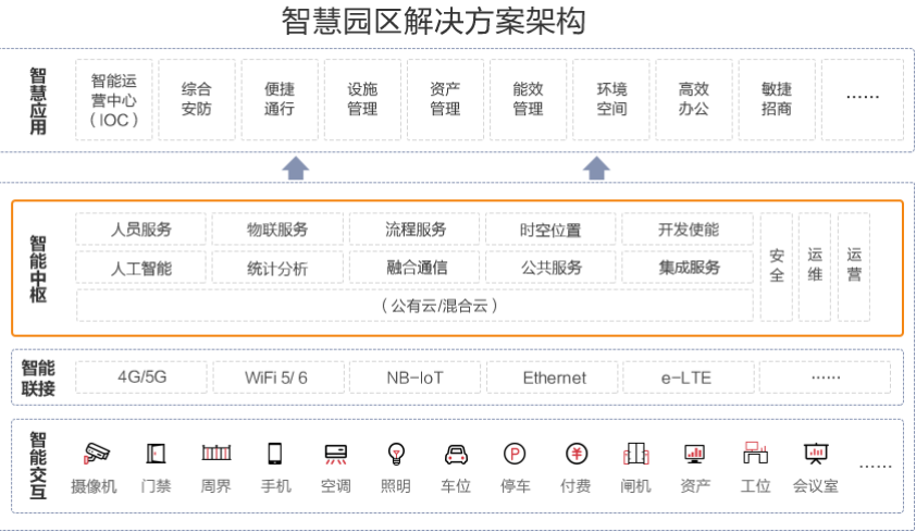 智慧園區(qū)解決方案依托華為產(chǎn)品組合,基于華為云,聯(lián)合生態(tài)伙伴,解決客戶問題。以數(shù)字平臺打造智慧園區(qū)數(shù)字底座,實現(xiàn)南向連接標(biāo)準(zhǔn)化,北向應(yīng)用服務(wù)化。