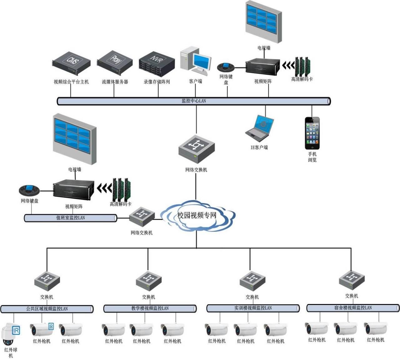 (1)分校區(qū)現(xiàn)有的監(jiān)控點遍布學(xué)校各個重要點位,包括教學(xué)樓、一體化樓、實訓(xùn)樓、辦公樓、學(xué)生宿舍、學(xué)生食堂、校內(nèi)重要場所等。通過光纖鏈路將前端各個點位匯聚到監(jiān)控中心,并統(tǒng)一傳到監(jiān)控中心集中存儲。
