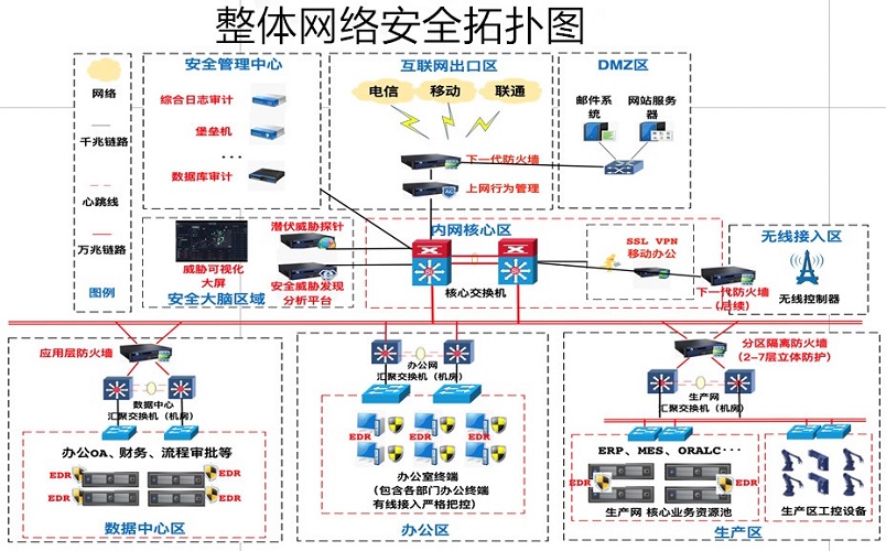 安全域劃分:集團網(wǎng)絡劃分成辦公網(wǎng)、研發(fā)網(wǎng)、生產(chǎn)網(wǎng),數(shù)據(jù)中心網(wǎng),通過下一代防火墻實現(xiàn)網(wǎng)絡的邏輯隔離和安全防護。