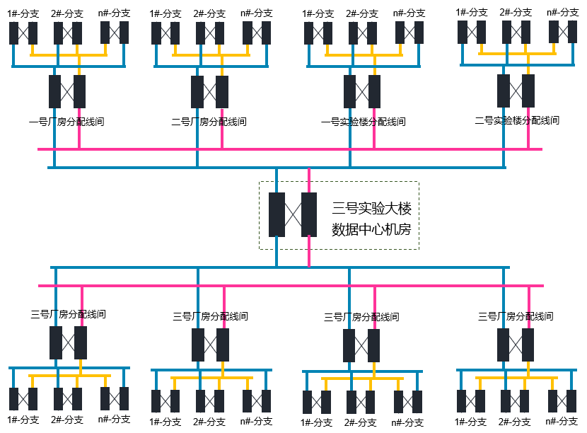 1、數(shù)據(jù)中心機(jī)房至匯聚中心至各樓棟分支機(jī)柜采用大對(duì)數(shù)電纜