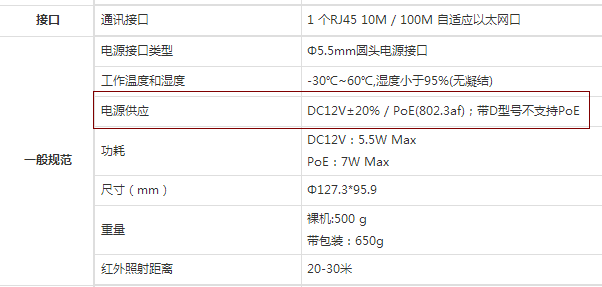二、海康威視的設備POE供電參數: